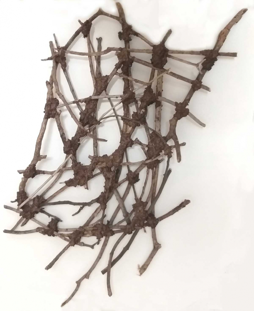 Composição de gravetos , papel machè, pigmento naturais e borra de café.