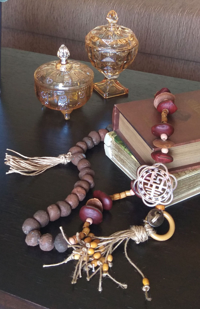 Colar com argila expandida , semente natural, argola , madeira e sisal.