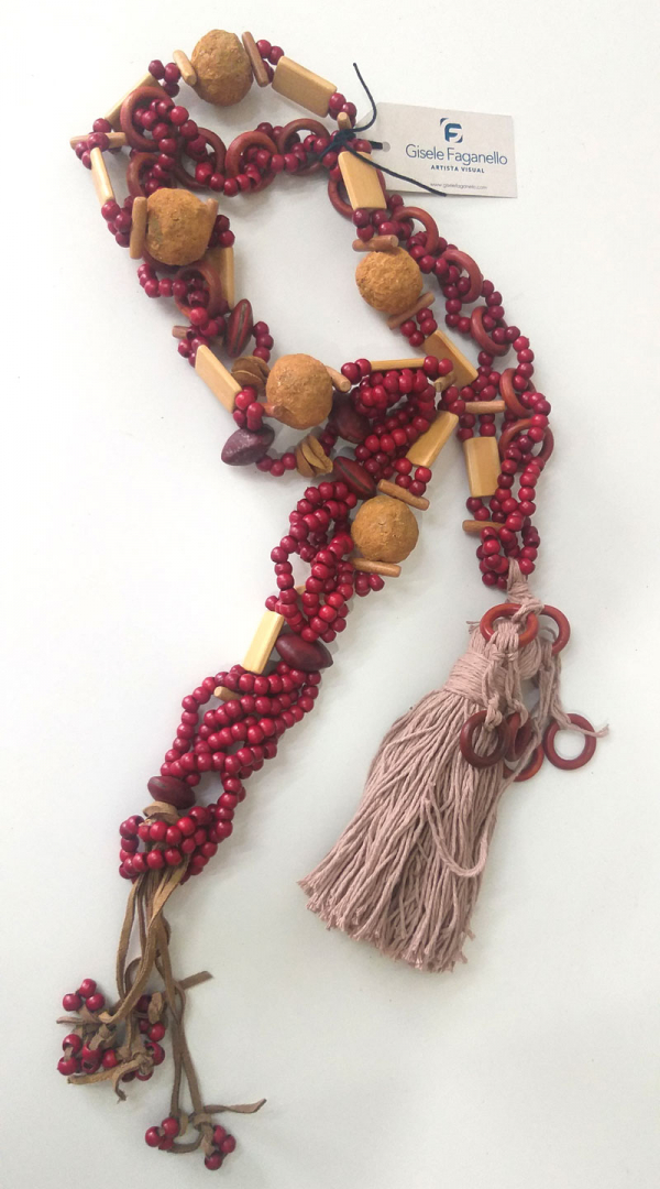 Colar com contas, madeira, couro e mâchè